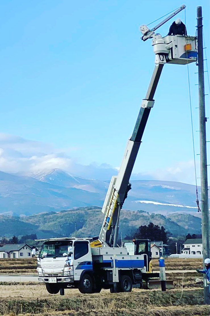 主に東北電力様からの業務請負施工を主とし、工場や住宅に電力を供給するために電柱の設置配線・引き込みを行っています。