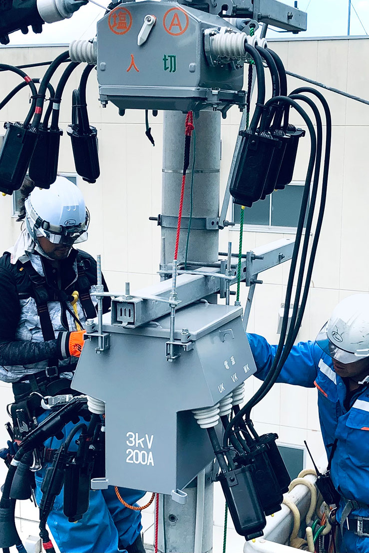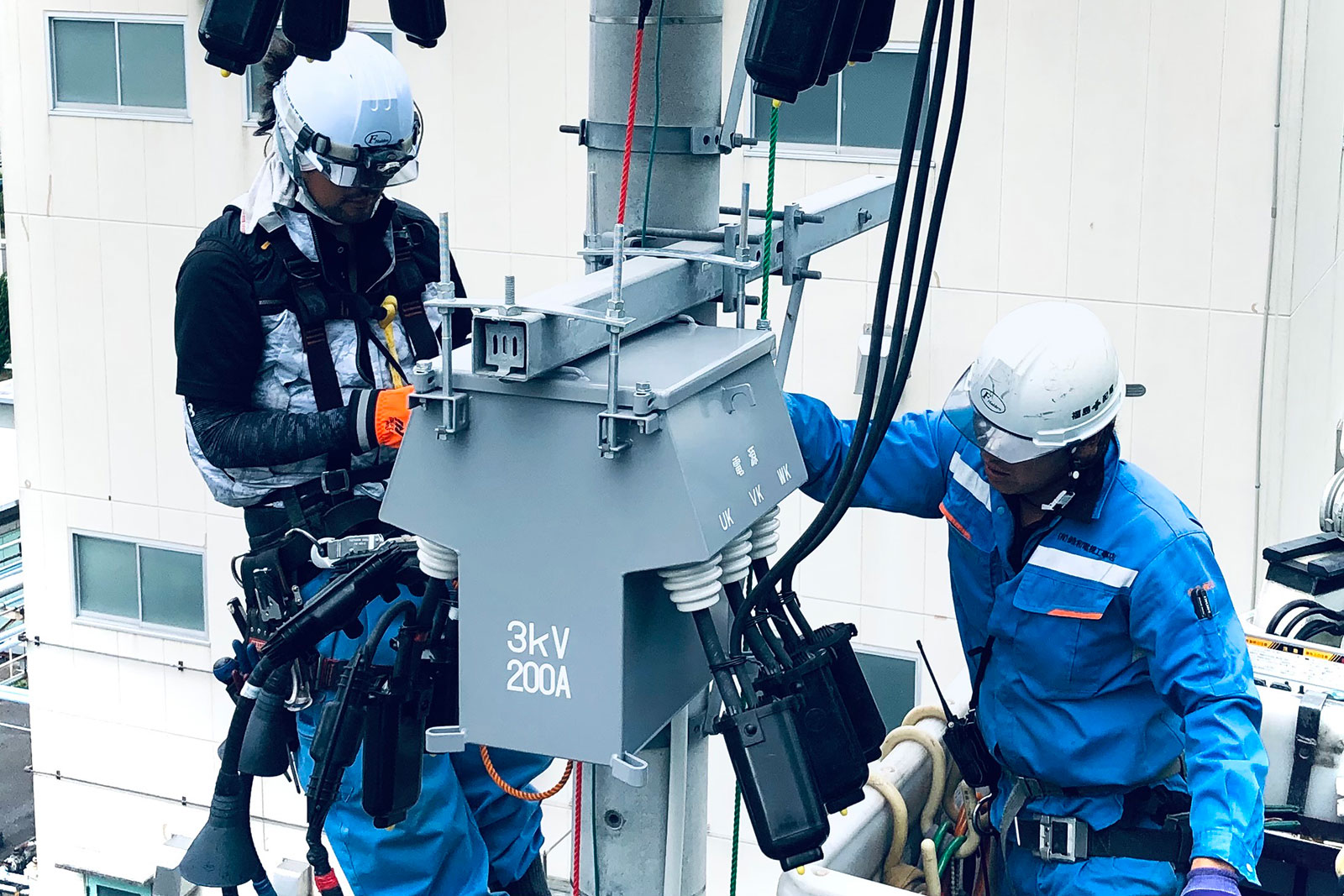 電線の新設・張り替えや変圧器の取り付け・取り換え、家庭や事業所に電線を引き込む引き込み線の工事といった仕事のほかに、災害等で破損した電線の修復や送電線に接触した倒木の除去などのメンテナンス作業もおこないます。